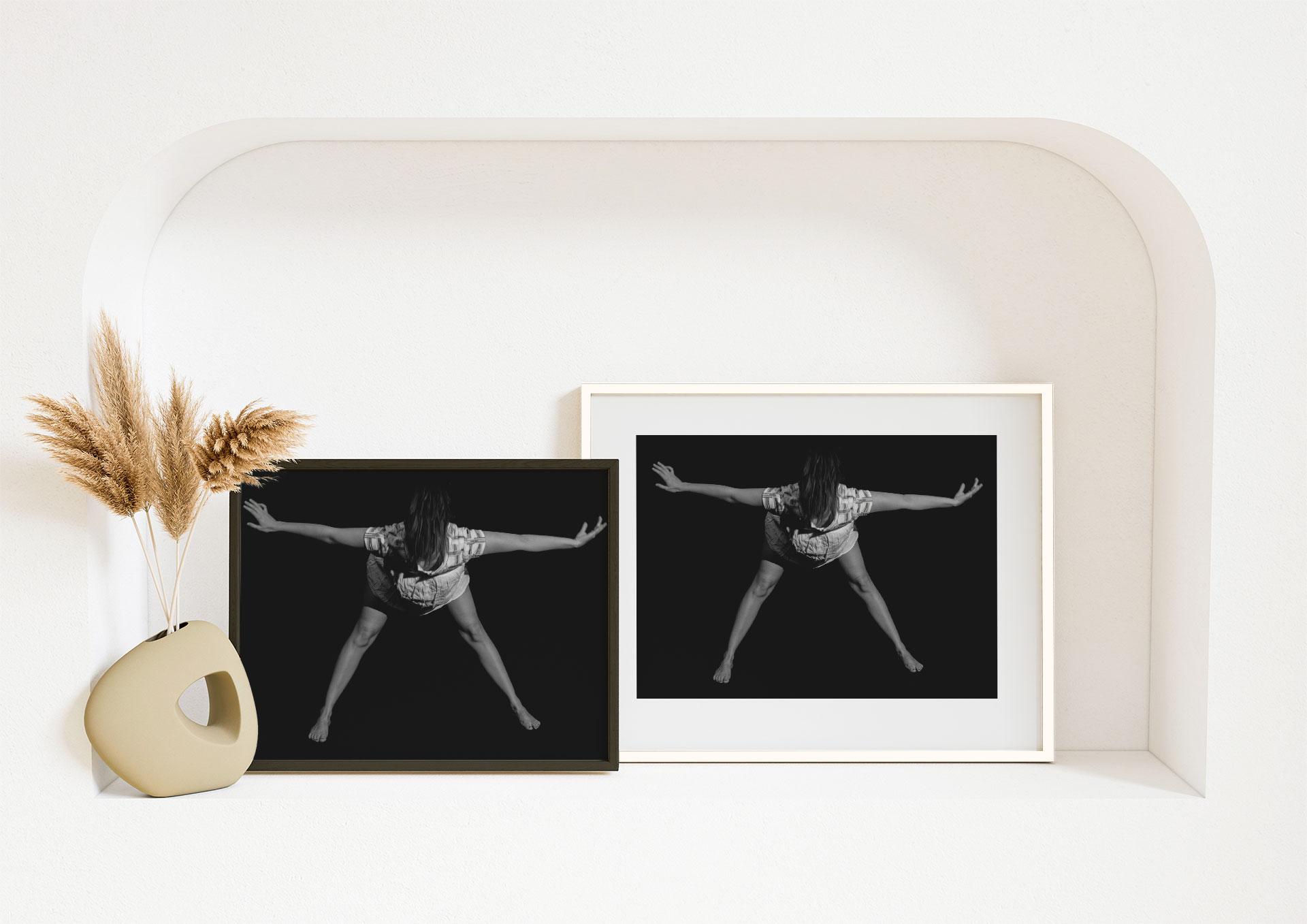 The image is a monochromatic shot of a dancer in a studio setting. The dancer, caught in mid-motion with their arms and legs spread out, exudes a sense of freedom and expression, while the dancer’s barefoot stance enhances the natural and raw aesthetic of the image. The background is completely dark, focusing all attention on the subject and emphasizing the contrasts between light and shadow.